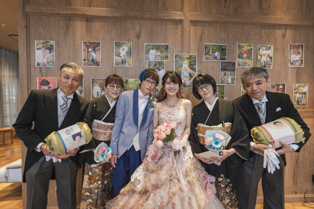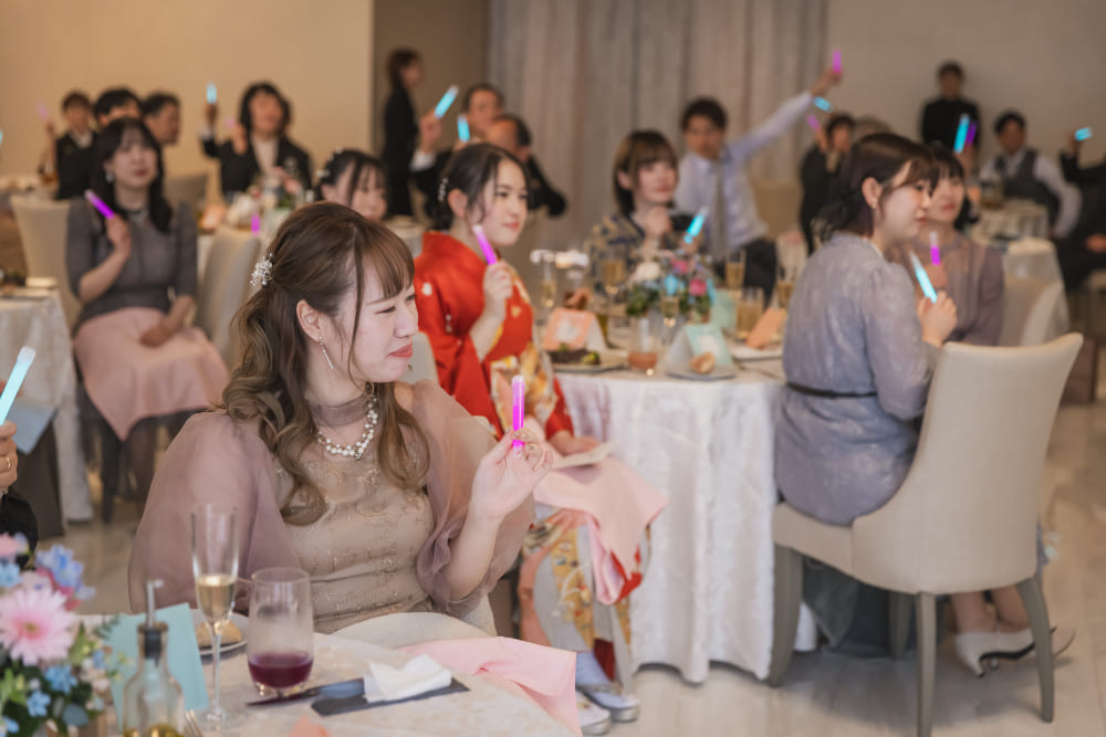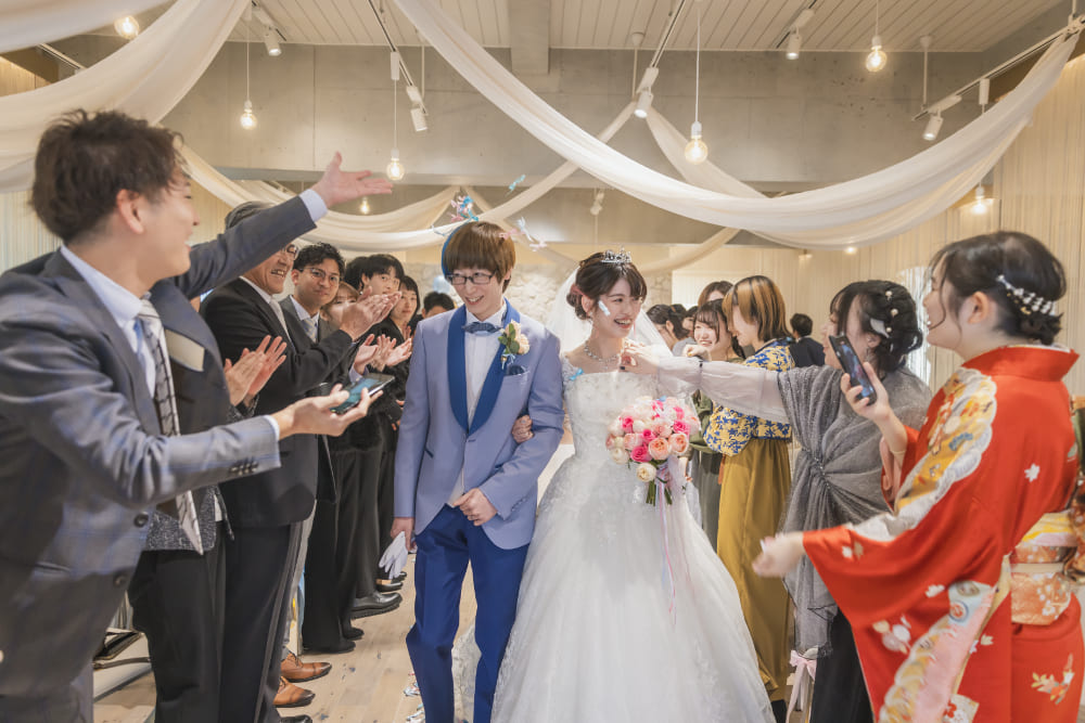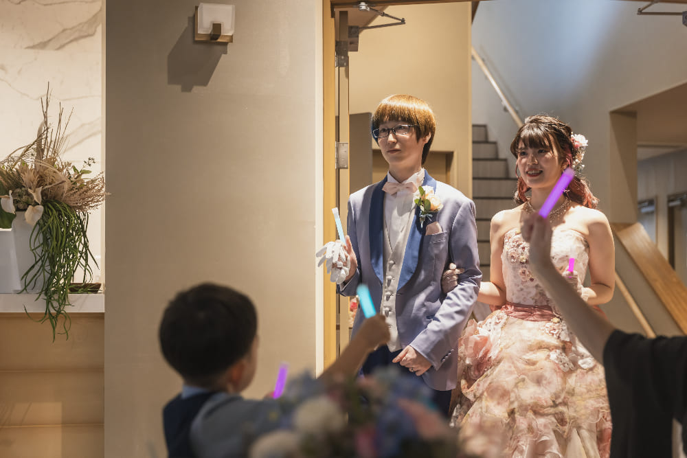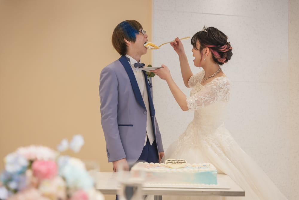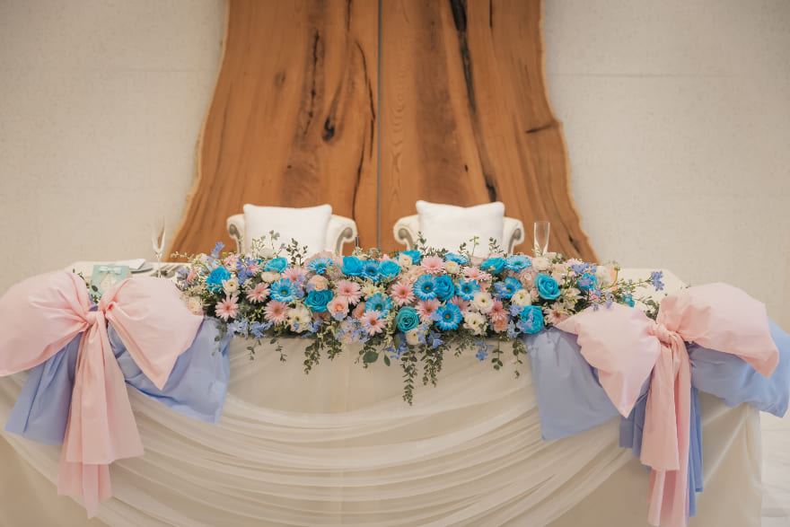 大切なゲストの前で誓いをたてたあとには、ブルーとピンクがまじりあったコーディネートや演出で。