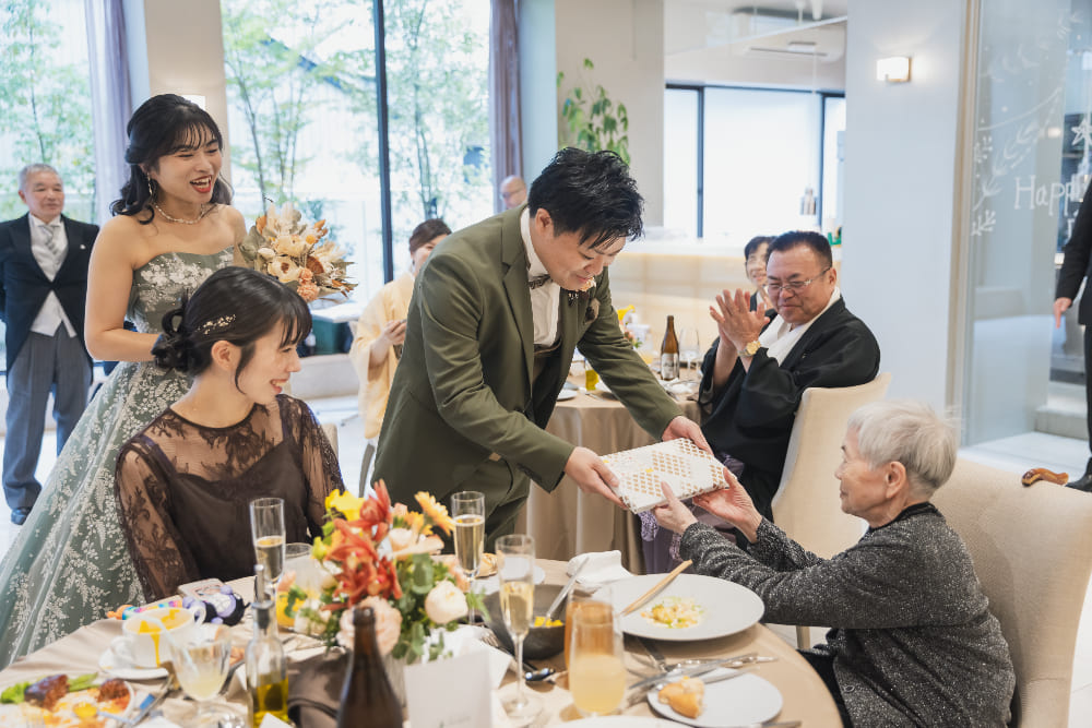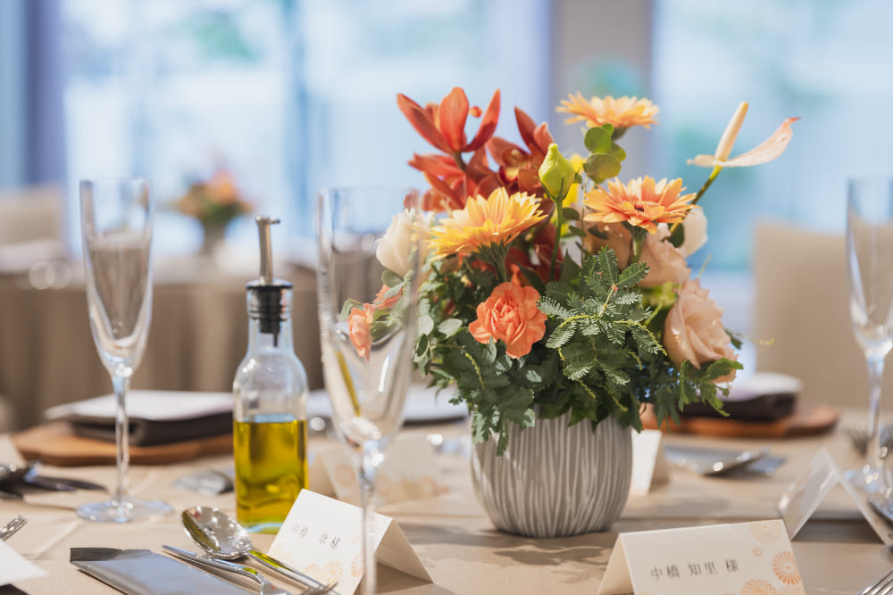 神前結婚式後の会場探しのご相談に来店されたおふたりに、レストランアイデンをご提案させていただきました。アイデンのランチ試食では、料理のクオリティーを大変気に入っていただき、ご成約となりました。ご親族を中心にした披露パーティーではそれぞれのご出身地である石川県と福井県にちなんだゲームもあり、和やかな雰囲気でお時間をお過ごしいただくことができました。